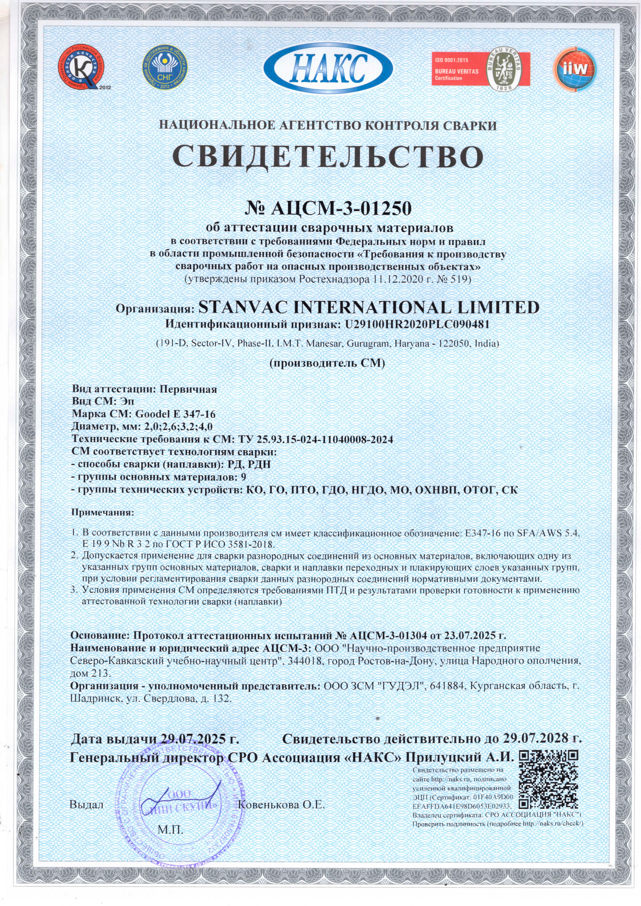 GOODEL E 347-16 - это аустенитный стабилизированный ниобием электрод с рутилово-основным покрытием с содержанием ферритной фазы 5-8%. Покрытие электрода с очень низким впитыванием влаги. Электрод предназначен для сварки стыков нестабилизированной и стабилизированной аустенитной, устойчивой к воздействию химических веществ CrNi стали, при температуре эксплуатации до 400°С, для коррозионностойких Cr типов стали. Наплавленный металл имеет высокие механические свойства при высоких температурах, подходит для сварки деталей и конструкций, работающих при высокой температуре. Имеет высокую стойкость к межкристаллитной коррозии. Электрод GOODEL E 347-16 применяется для сварки следующих марок стали: 12X48H9T, 12X18H10T, 12X18H12T, AISI 321, 347 и т. п.