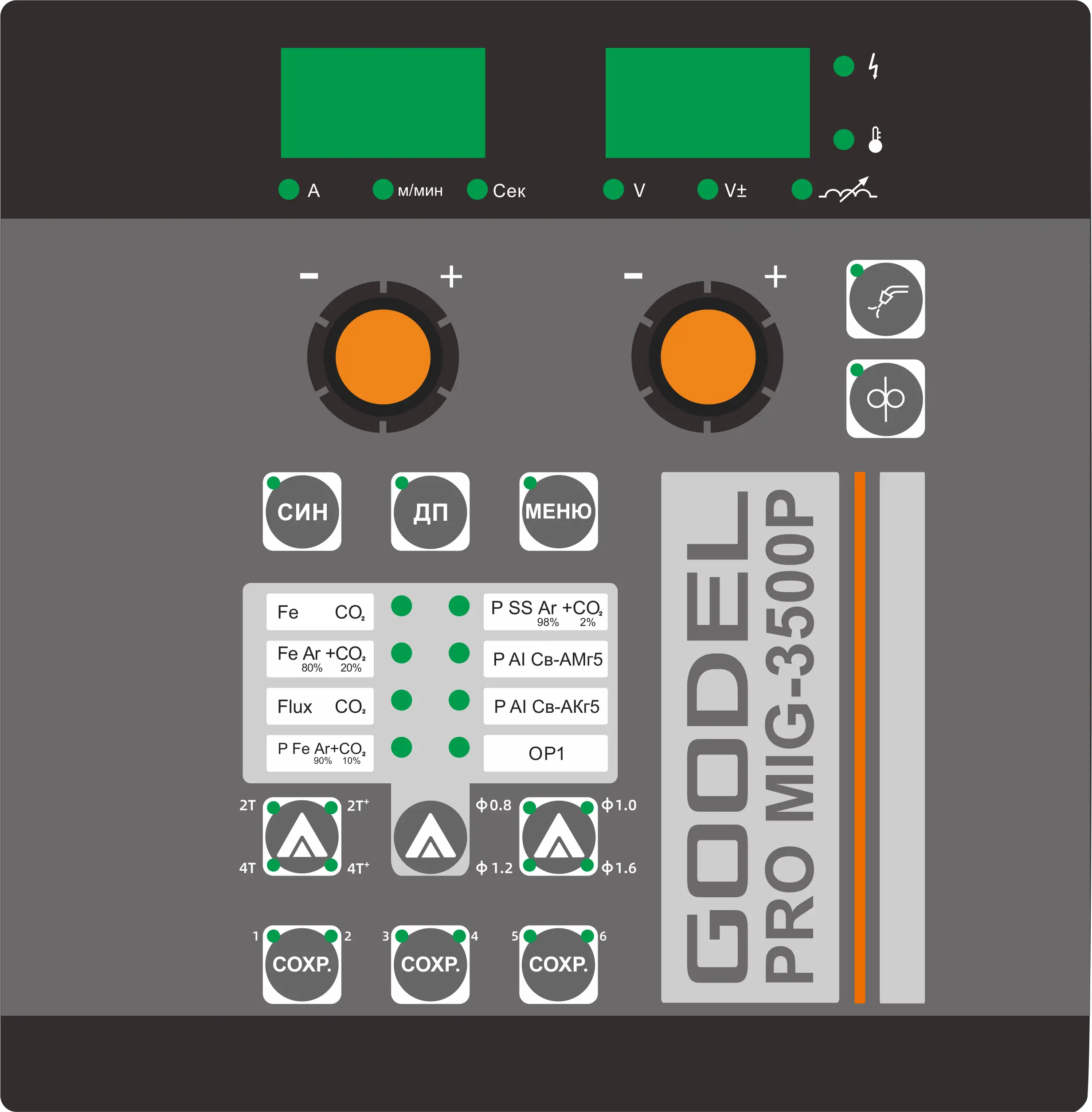 Аппарат имеет широкий пакет предустановленных программ, разработанных для различного типа проволоки, защитного газа и свариваемого металла, а также импульсные режимы сварки с использованием одинарного или двойного импульсов.